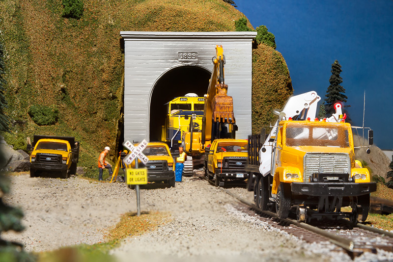 Jesse Weigand has obviously become quite a fan of the Railroad-Alaska television series. He added a this module to his Route87 section that has become a cornerstone of our annual East Coast Meet. The Freightliner FL80 was built using a resin cab, Lonestar Models stakebed, and Herpa knuckleboom crane. The various Ford pickup trucks are all modified River Point Station models. Several have been converted to regular cab configurations. The Case excavator is from Promotex, the SD70MAC locomotive from Athearn. On display at the 2015 East Coast Meet in W. Springfield, MA January 24-25, 2015.