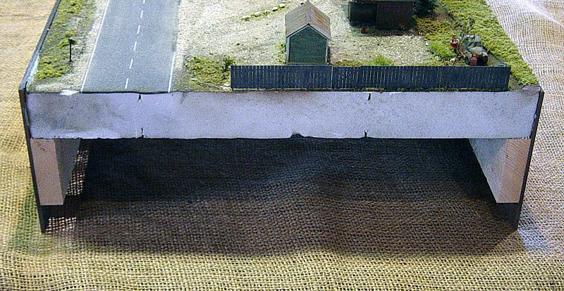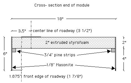 In my module, I created an intersection with a gravel road (shown above) but things like road construction, alternating direction, bridges etc. are all possible between the two exiting points. Going much beyond this quick "how-to" would be a lesson in structure building and scenery but I'll leave that all to the creativity of any and all who decide to participate. I have provided a sketch of the end view of the module. This technique allows for a sturdy, light weight module that is easily transported and links well to adjoining dioramas. Thanks to Chester for this quick tutorial and to everyone involved in the Route87 module standards project. Refer to the Photo Gallery Search Index for photos of Route87 modules. If you have any comments or questions please refer to the Route87 web site or contact us. We are really looking forward to nurturing this concept and seeing just how creative all of you can be. If you have any comments or questions please refer to the Route87 web site or contact us. [posted 03/11/2010] |