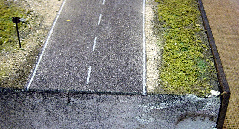 In creating my diorama, which is 30 inches in length, I located the roadway first and masked it's exact location on the styrofoam with masking tape. This allows for a clean surface on which the Busch adhesive backed roadway will later stick while working on the rest of the diorama. I did my scenery and ground cover, then removed the tape and placed the self-adhesive roadway material in this manner. Some minor blending of ground cover to the road surface adds to it's realism if so desired. Anything can happen between the ends of the module in terms of elevation, road direction and/or condition as long as the road material meets at the proper location (offset from front edge) as it enters and exits the diorama.