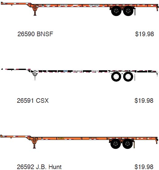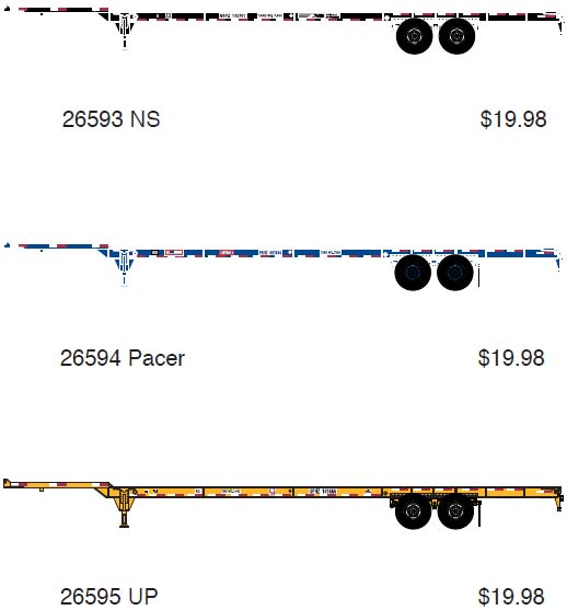 Athearn has also announced their recently tooled 53' domestic (North American) container chassis available in pairs with different road numbers in the paint schemes shown above. Expected delivery is March 2007.