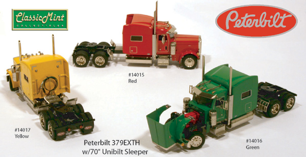 Classic Mint Collectibles has announced their brass 1/87 models of Peterbilt 379EXTH with 70" sleeper are now shipping. Models feature all brass construction with detailed Cummins Signature 600 engine, plated exhaust heat shields, plated Alcoa wheels, tires with raised letters, detailed engine compartment and cab interior, plated bumper, 70" Unibilt sleeper option, trailer electrical cable and air hoses, and Holland fifth wheel.