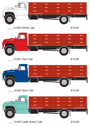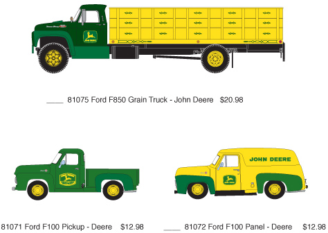 Athearn has announced several new offerings based on their Ford '55 Ford F-100 pickup and panel and the 1968 Ford F-850 Super Duty truck. Shown above are a new grain body on the F-850 and some special John Deere paint schemes. Also announced are a John Deere disc plow, John Deere 4020 tractor, individual John Deere 650H bulldozer, and Ford Motor Company delivery trucks based on the F-100 pickup and panel trucks.