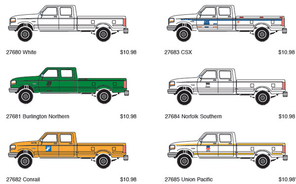 Athearn has announced models of a 1993 Ford F-350 crew cab pickup truck painted in the schemes shown above. Models are based on existing Trident tooling. Delivery expected in August 2008.