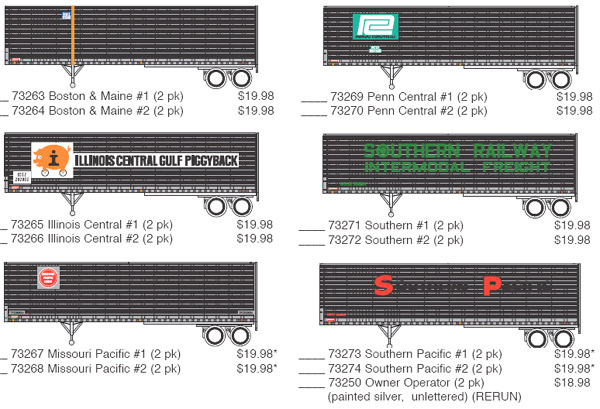 Athearn has announced six new paint schemes plus a painted, unlettered version for their 40' Fruehauf Z Van model. Expected delivery is January 2009.