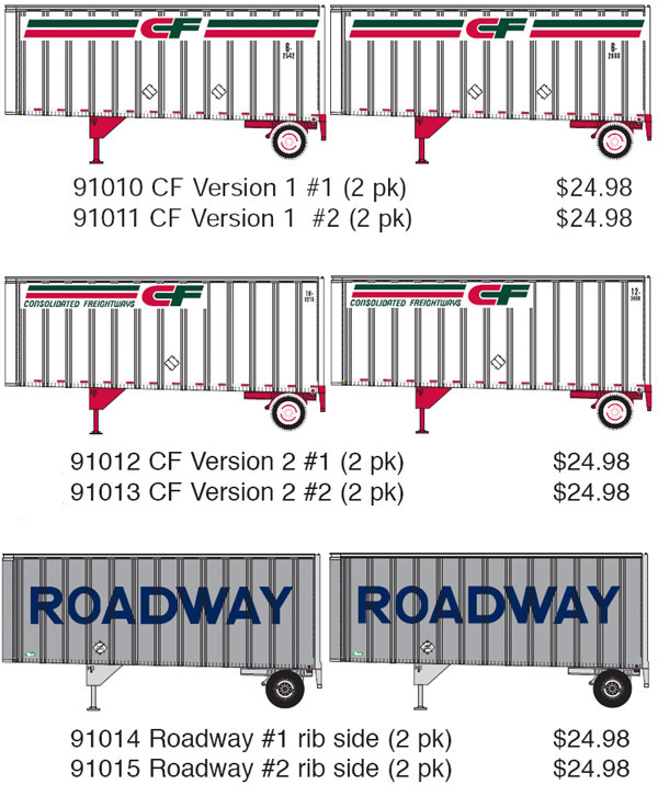 Athearn has announced the first release of paint schemes for the former A-Line Pines 28' pup trailers in the schemes shown above. Expected delivery is May 2009. Please note: These trailer models are intended for railroad flatcar use and do NOT include a convertor dolly!