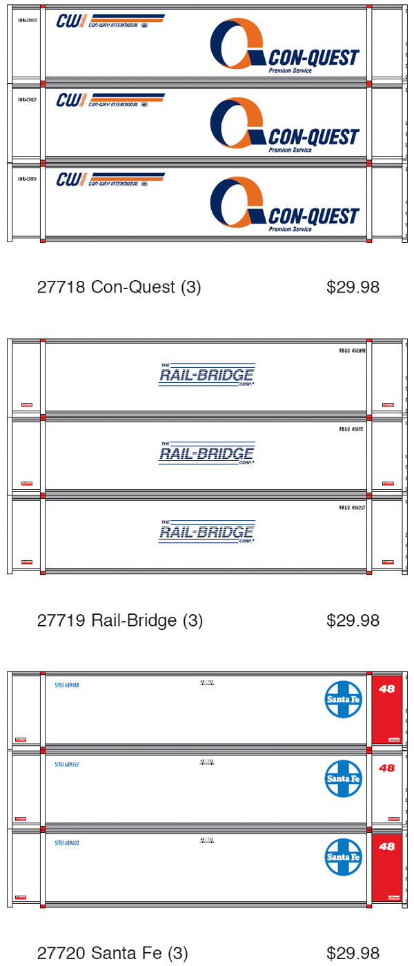 Athearn has announced a new release of the 48' containers in the schemes shown above packed three per pack as indicated. Expected delivery is May 2009.