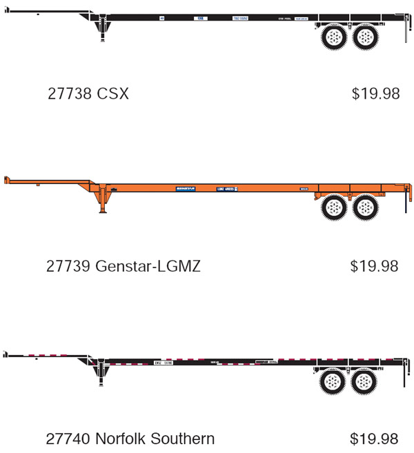 Athearn has announced a new release of the 48' container chassis in the schemes shown above. Though not indicated specifically they are packaged two per package. Expected delivery is May 2009.