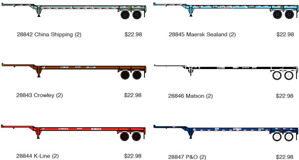 Athearn has announced a new release of paint schemes for their 45' container chassis packed 2 per package. Delivery is expected in October 2009.