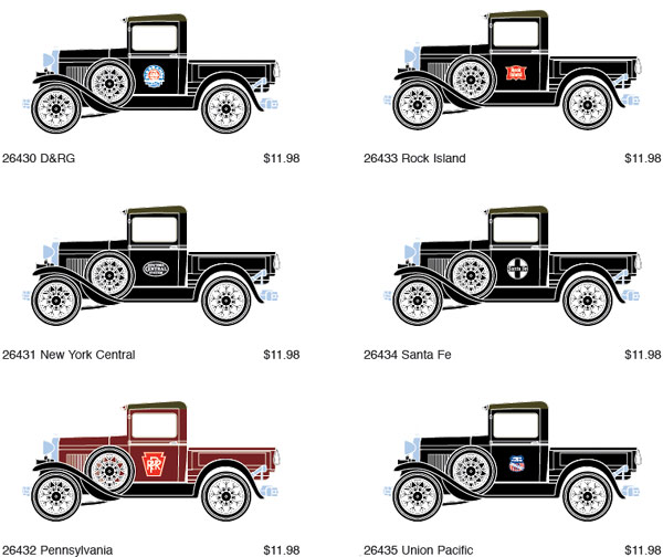 Athearn has announced a new release of paint schemes for their Ford Model A pickup truck in railroad colors. Delivery is expected in October 2009.