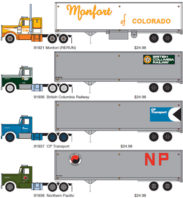 Athearn has announced a new release of paint schemes for their Kenworth W900 truck tractor and 40' van trailer. Note the Monfort truck shown at the top is a 40' refrigerated trailer. Also not the Monfort truck is a rerun and if the past sales are any indication will be gone very quickly. We strongly urge everyone who's interested to get your pre-orders into your favorite dealer so you're assured of getting one this time! Delivery is expected in November 2009.