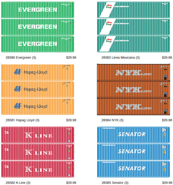 Athearn has announced new 3 packs of their 40' containers in the paint schemes shown above. Expected delivery is September 2009.