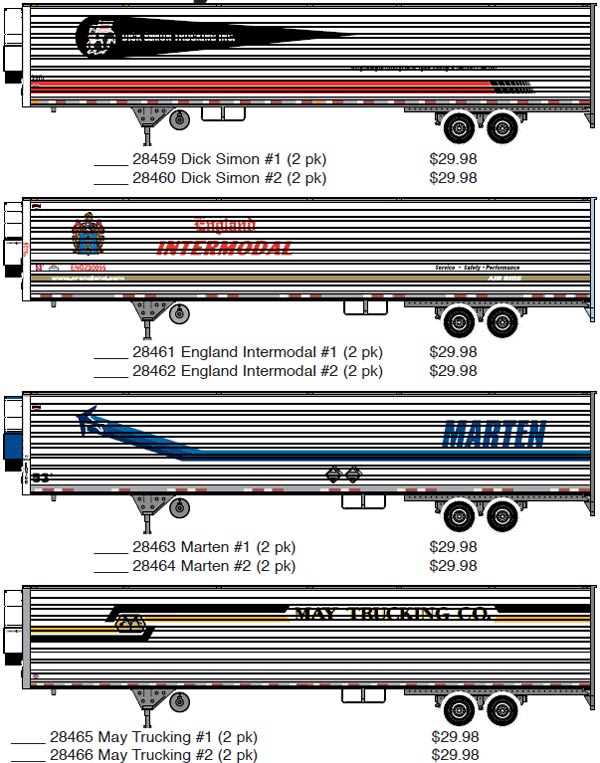 Athearn has announced new paint schemes for their 53' Utility refrigerated trailers. Expected delivery is November 2009.