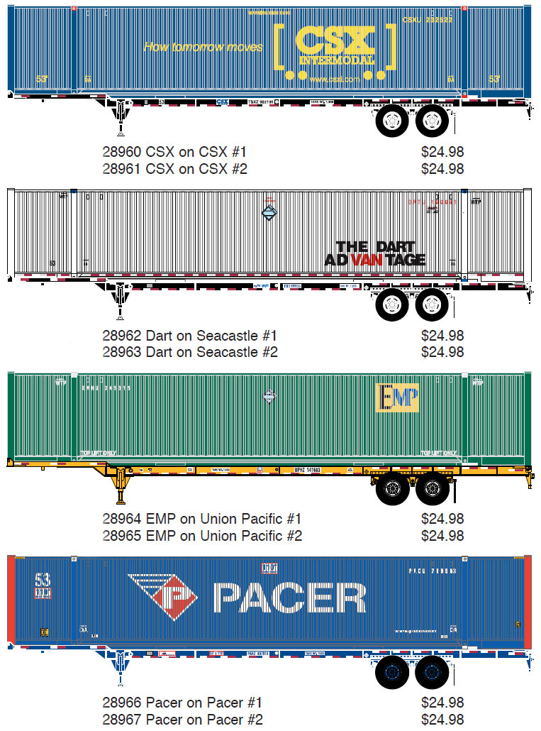 Athearn has announced another release of their 53' domestic containers and 53' chassis models in the paint schemes shown above. Delivery is expected in June 2010.