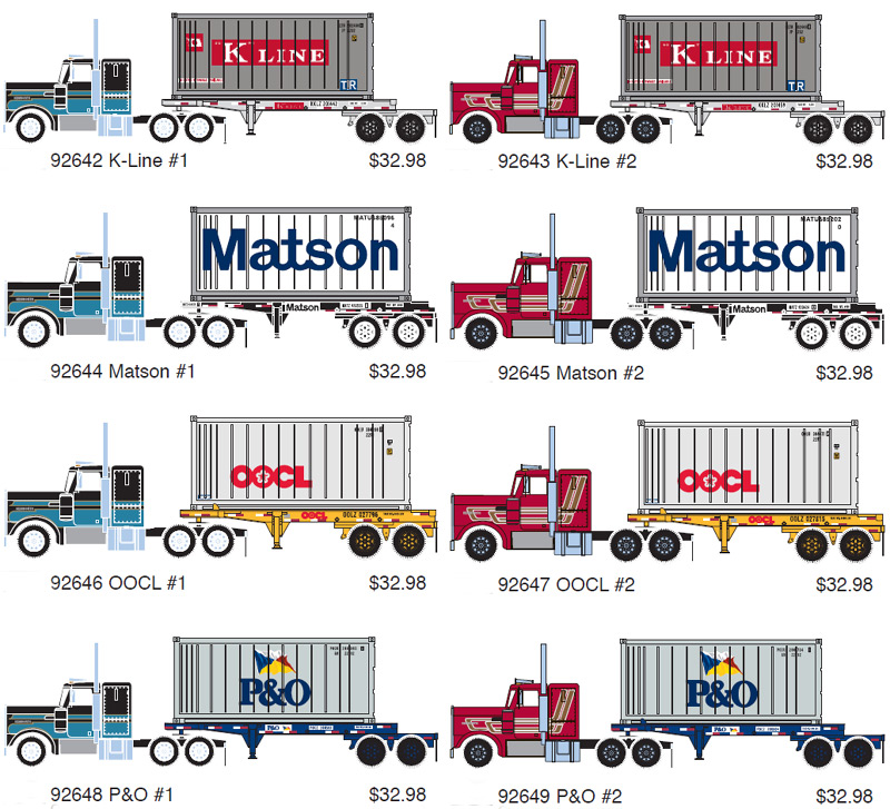 Athearn has announced a new release of their 20' container on 23' chassis and Kenworth W900 truck tractor combinations in the paint schemes shown above. Delivery is expected in June 2010.