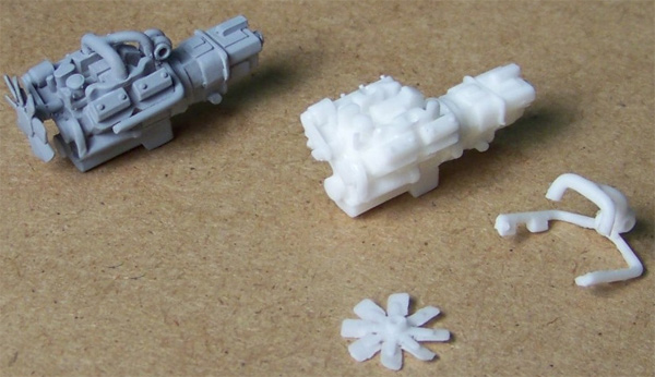 Ralph Ratcliffe Models announces the immediate availability of a new 1/87 scale Mack Maxidyne V-8 diesel engine coupled with a 5 speed MaxiTorque transmission. The kit includes three separate parts (shown on the right side of the photo above). The assembled and primer painted engine is shown on the left. Each kit includes parts for one engine/transmission only. This kit can also represent the Mack ENDT 866 Thermodyne diesel engine.