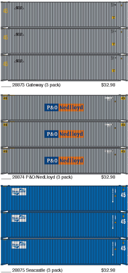 Athearn has announced a new release of 45' ocean container models (3 per package) in the paint schemes shown above. Delivery is expected in August 2011.