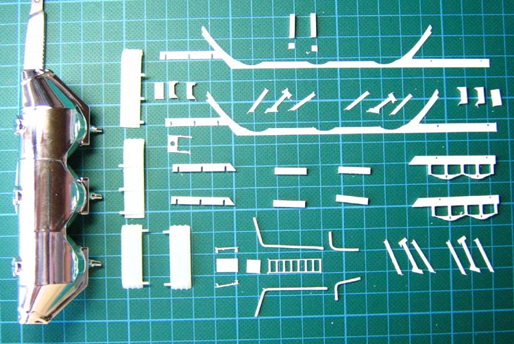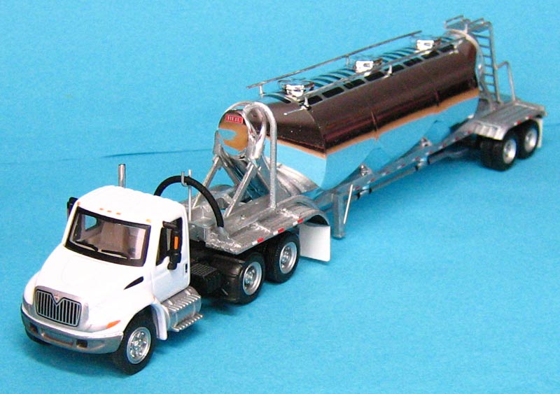 Decalprint will be introducing this new resin and styrene kit for a pneumatic bulk trailer. This kit has some very interesting innovations. The main tank body was prototyped with CAD (computer aided design). The tank body will be chrome plated exactly as shown above. The piping and fenders are 3D printed parts. The ladders are thermoformed Evergreen styrene profiles. All other parts are CNC milled. We're told North American modelers will be able to purchase this kit from Truck Stop Models with an estimated May 2011 arrival.
