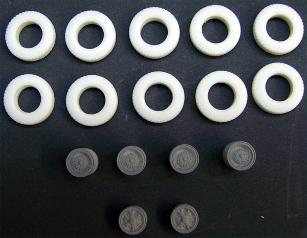 Ralph Ratcliffe Models has introduced a new resin wheel set perfect for most modern trucks, especially the Mack Granites and Superliners, Petes, and KWs and is perfect for all modern fire apparatus. This set is also an excellent choice for any of Ralph's Mack cabs if you want polished aluminum wheels instead of the cast spoke wheels which are more typical. The set is cast resin and includes four rear 10 hole aluminum wheels, two front 10 hole aluminum wheels, eight 11.00 x 22.5 tires, and two 12.00 x 22 high flotation front tires.