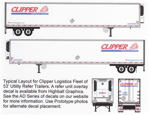 Highball Graphics has announced a new decal sheet for Clipper Logistics' Utility 53' refrigerated trailers used in intermodal service. Highball Graphics also has decals available for CR England 53' Reefer Containers, NFI 53' Reefer Containers, and JB Hunt "Intermodal" all corrugated 53' container.