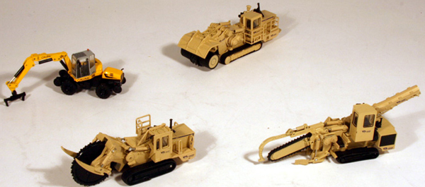 Zycon Models is selling limited production die-cast models of Italian prototype Tesmec equipment used for stringing power lines, fiber optic cables, and electric power lines for railways. Four individual models are currently available; Trencher 975 Rocksaw (lower left), Gallmac RMW115 Railroad MOW handler (upper left), Trencher 1150XHD Rockhawg (upper right), and Trencher 885 Chainsaw (lower right). These are being sold exclusively on eBay; check the Zycon Models web site for details.