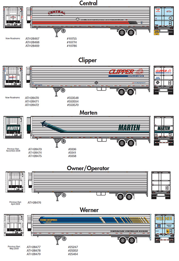 Athearn has announced two new paint schemes (Clipper Logistics and Central Refrigerated) and another run of previously released (2009) Utility 53' refrigerated trailer models in the paint schemes shown above. Delivery is expected in March 2014.
