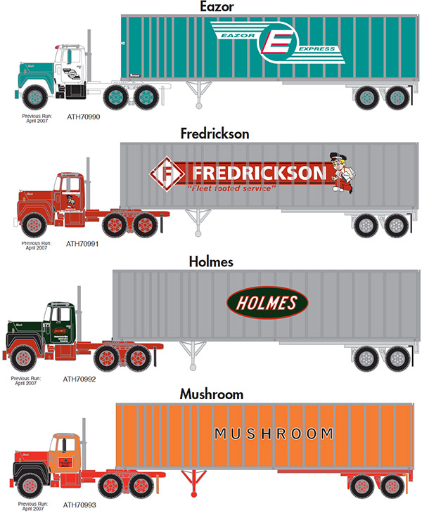 Athearn has announced a repeat production run of some of the most popular early run (2007) Mack R model truck tractor and 40' exterior post trailers in the paint schemes shown above. Delivery is expected in March 2014.