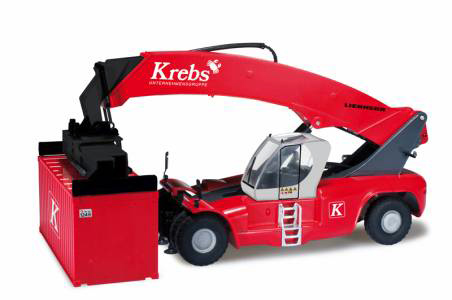 Herpa has released a new HO scale model of a Liebherr container carrier truck called Reachstacker LRS 645. Decorated for the (presumably German) corrosion protection company Krebs.
