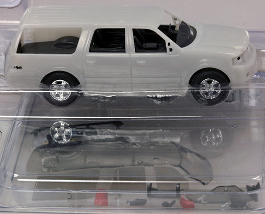 Masterbilt Models is offering River Point Station 2007 Ford Expedition models in undecorated, partially assembled "kit" form. These models have been stripped of their factory paint and decoration on the body while leaving the factory finish on the chrome wheels, grille, headlights, and tail lights intact. Shown above are the partially assembled body on chassis in its shipping tray and the parts removed for paint stripping (front bumper guard, grille, roof rack, tail lights, mirrors, "glass," license plated holder, and spot lights) in separate shipping container. Check the Masterbilt Models web site for more details and pricing; quantities are limited to supply on hand. [posted 07/01/2014]