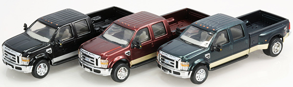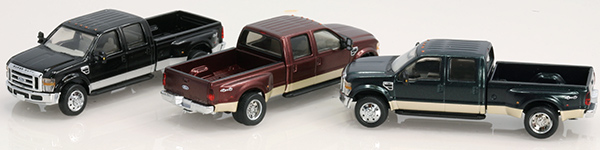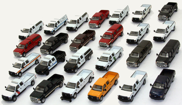 River Point Station 2008 Ford F-350/F-450 crew cab pickup trucks have all but disappeared from dealers' stock. We've just gotten our hands on our first batch and have these photos to share. Above are F-450 variants with 20" aluminum wheels with the eight hole design. These wheels are significant in that the holes are open through on both front and rear wheels; no small feat of engineering! Shown immediately above is a photo for the complete group of F-350/F-450 models released in this batch, courtesy of Zycon Models. If you see any of the new Ford crew cab F-350/F-450 pickups you better grab them while you can! Check with your favorite dealer (soon) for availability as some models are already in very tight supply! [posted 06/01/2014]