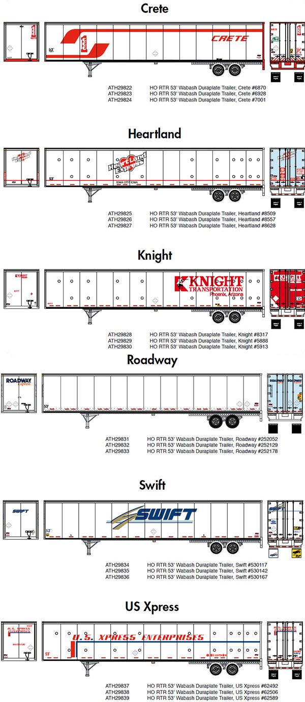 Athearn has announced a new production run of their 53' Wabash Duraplate trailer model in six different paint schemes as shown above. Each of the decorated models will be offered individually with three different unit numbers. Delivery is scheduled for May 2016. [posted 07/05/2015]