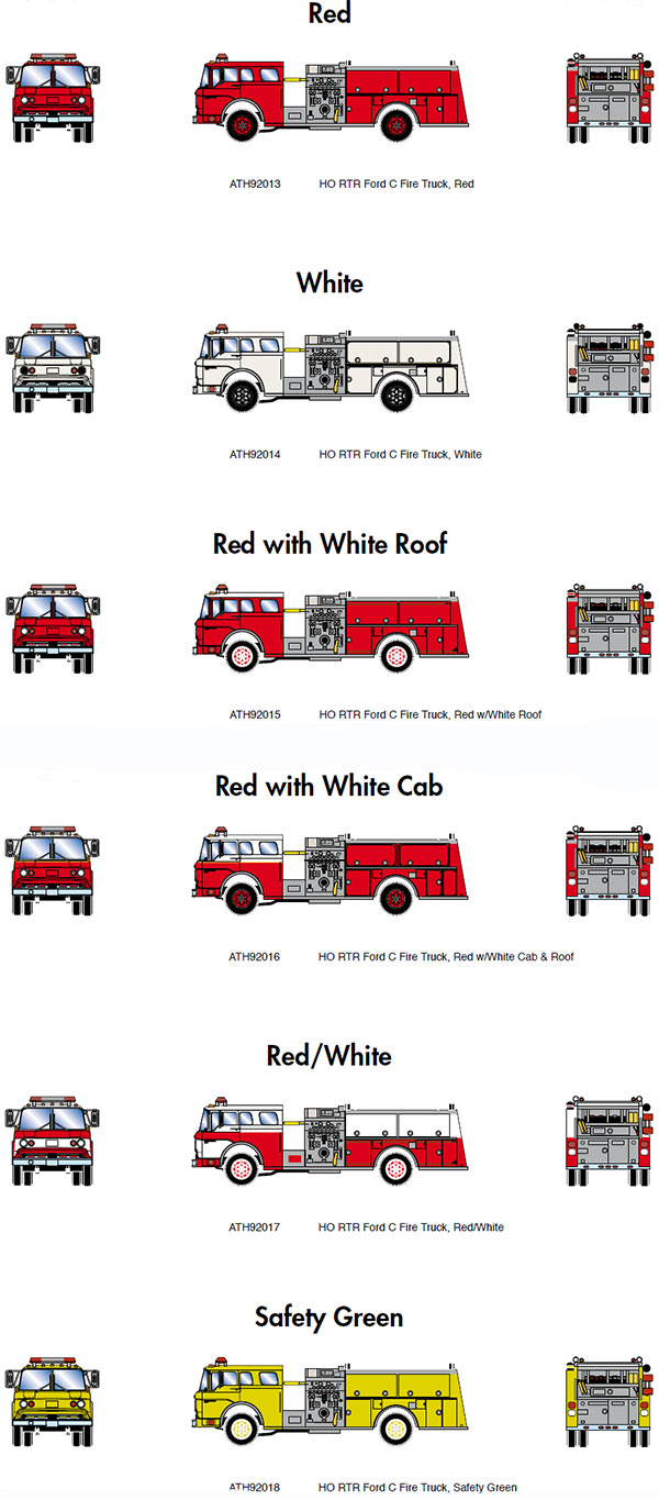 Athearn has announced a new production run of their Ford C canopy cab fire pumper model in six different paint schemes as shown above. This batch is fully painted but with no lettering or unit identification numbers. Delivery is scheduled for July 2016. [posted 09/20/2015]