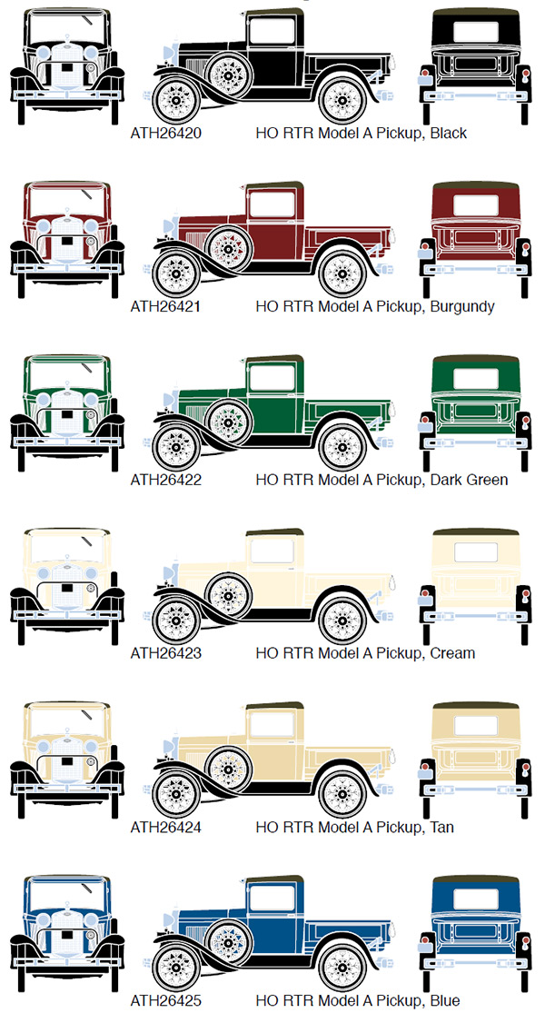 Athearn has announced a new production run of their Ford Model A pickup in six different paint schemes as shown above. Delivery is scheduled for December 2016. [posted 02/09/2016]