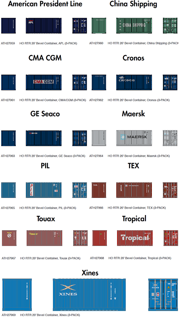 Athearn has announced a new production run of 20' ocean container models in the eleven paint schemes as shown above. Estimated delivery is February 2018. [posted 04/10/2017]