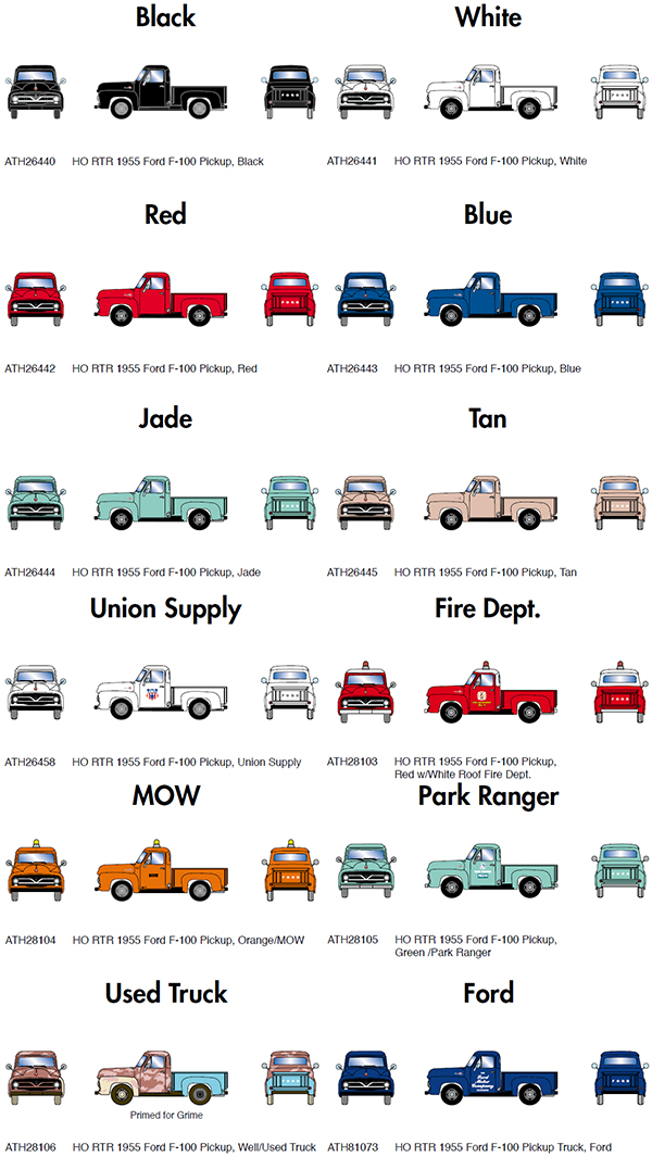 Athearn has announced a new production run of 1955 Ford F-100 pickup truck models in the twelve paint schemes as shown above. Estimated delivery is February 2018. [posted 04/10/2017]