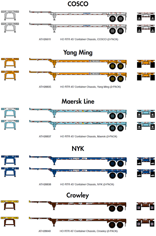 Athearn has announced a new production run of their 45' container chassis models in the five paint schemes shown above. Expected delivery is November 2018. [posted 12/01/2017]