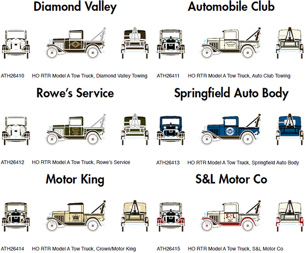 Athearn has announced a new production run of their Ford Model A tow truck models in the six paint schemes shown above. Expected delivery is November 2018. [posted 12/01/2017]