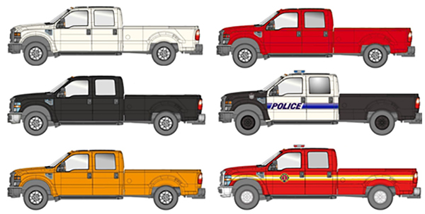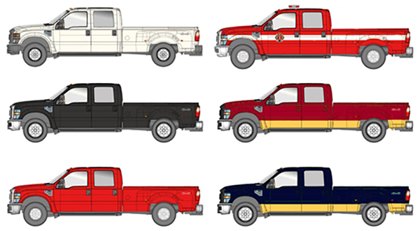 River Point Station has announced a new production run of their 2008 Ford F-350/450 XLT crew cab dual rear wheel (dually) models in the six paint schemes shown above. Delivery is expected in early 2018. [posted 12/14/2017]