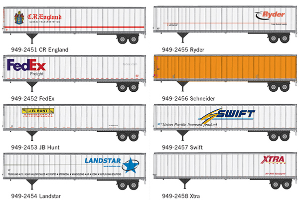 Walthers SceneMaster has announced a new production run of their Stoughton 53' van trailers in the eight paint schemes shown above that include some all new paint schemes. Packed two per package, expected delivery is October 2017. [posted 06/26/2017]