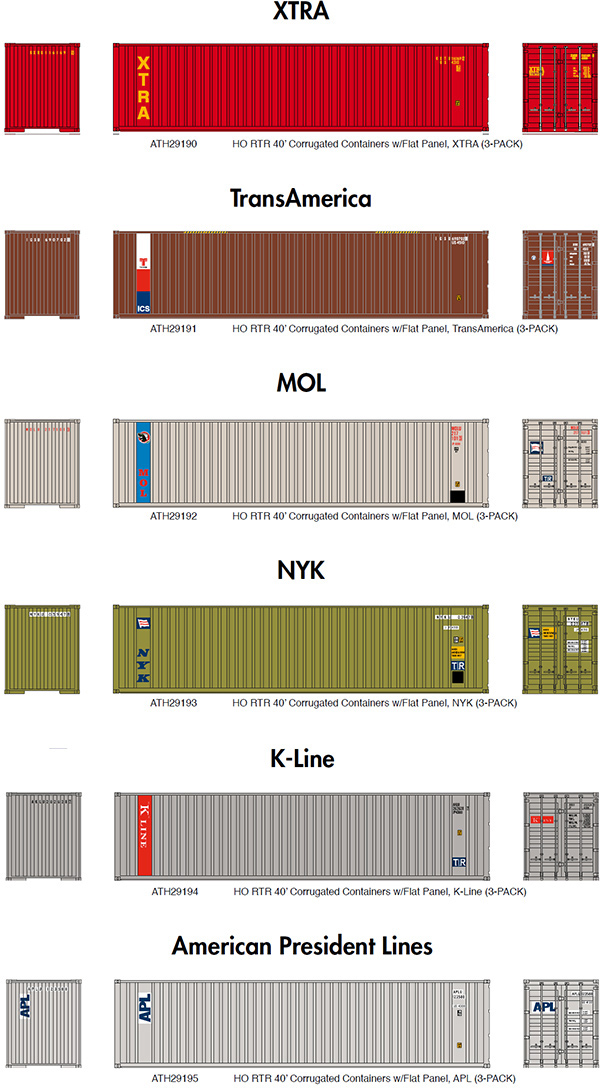 Athearn has announced a new production run of 40' ocean container models with two flat panels per side in the six paint schemes as shown above. Estimated delivery is January 2018. [posted 03/10/2017]