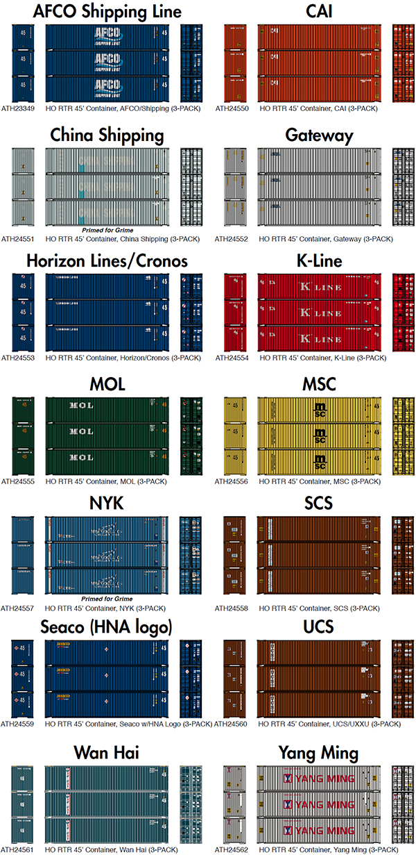 Athearn has announced a new production run of their 45' ocean container models in the 14 fleet paint schemes shown above. Expected delivery is October 2018. [posted 11/01/2017]