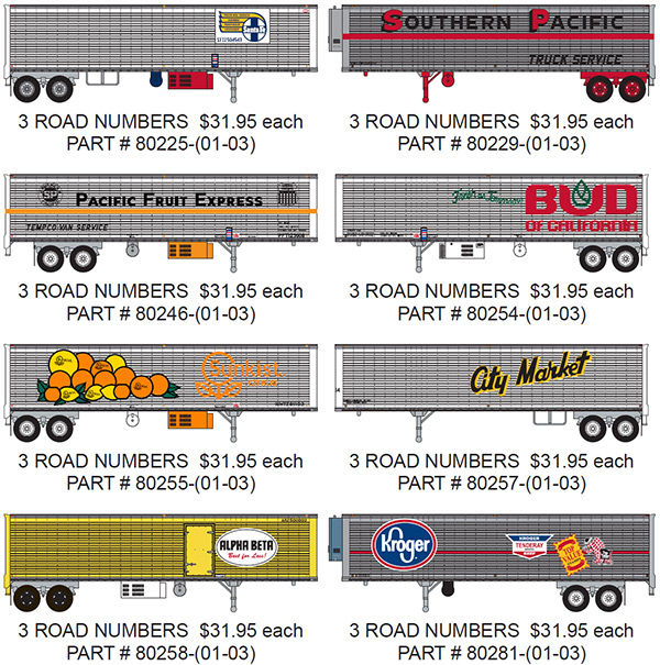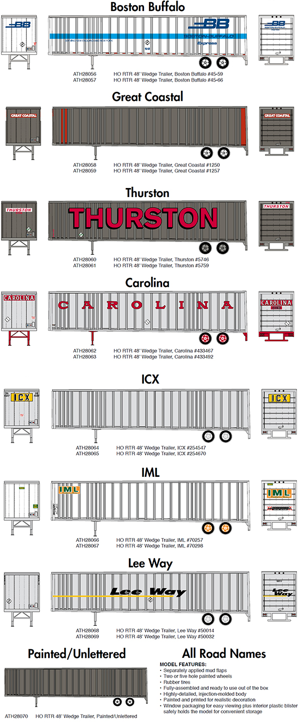 Athearn has announced a new production run of their 48' exterior post wedge trailer models in the 8 fleet paint schemes shown above. Expected delivery is October 2018. [posted 11/01/2017]