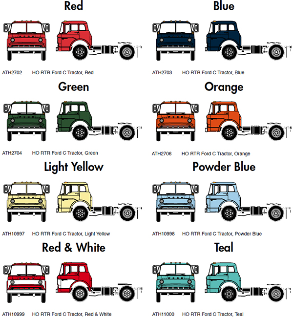 Athearn has announced a new production run of their Ford C cab truck tractor models in the 8 paint schemes shown above. Expected delivery is October 2018. [posted 11/01/2017]