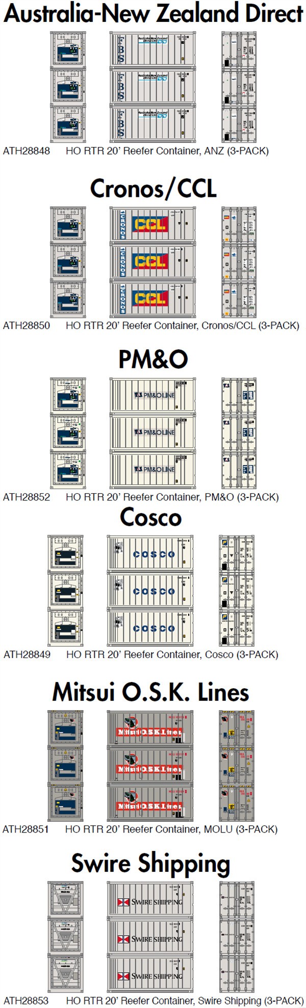 Athearn has announced a new production run of their 20' refrigerated container models in the six paint schemes shown above. Expected delivery is December 2018. [posted 01/01/2018]