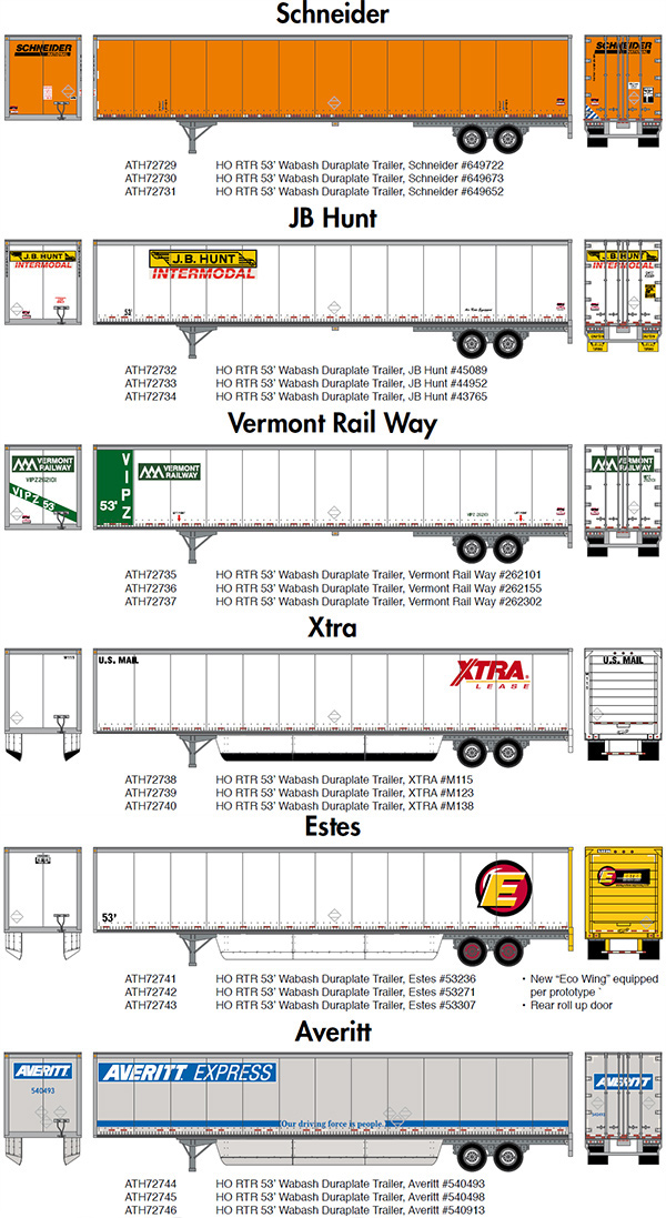 Athearn has announced a new production run of their 53' Wabash Duraplate trailer models in the six paint schemes shown above. Note some versions have roll up doors and, for the first time, Athearn is including side skirts on some versions. Expected delivery is December 2018. [posted 01/01/2018]