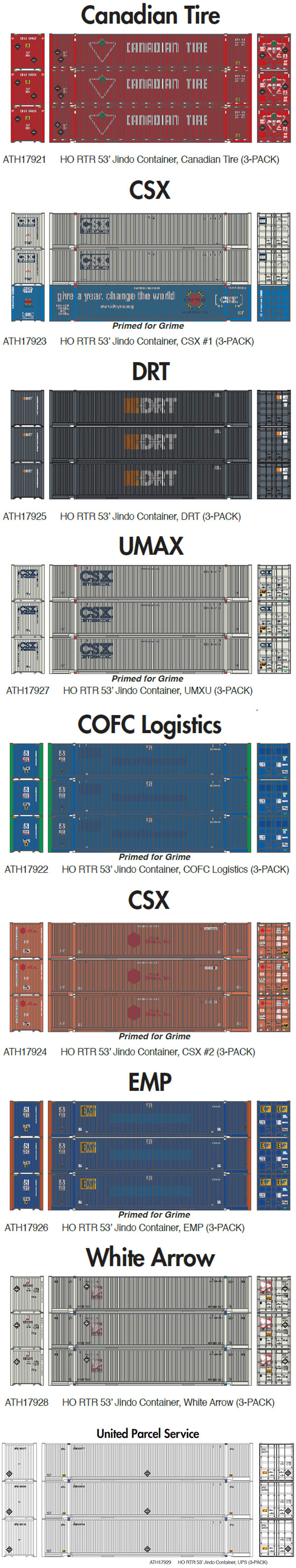 Athearn has announced a new production run of their Jindo 53' domestic containers in the paint schemes shown above. Expected delivery is May 2019. [posted 07/12/2018]