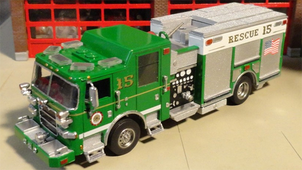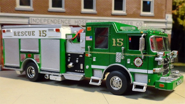 – 6 open side cabinets with doors that can be painted separately and attached as desired by the modeler – Modular rescue body construction – Separate pump module with finely detailed separate pump panels and LDH inlets – Deck gun and booster reel – Clear cast cab lightbars – Federal Q siren, Roto-Ray, and two Mars lights – Detailed cab interior with one drivers seat and five crew seats – Finely detailed diamond plate used extensively – Frame with engine detail, and exhaust pipe
