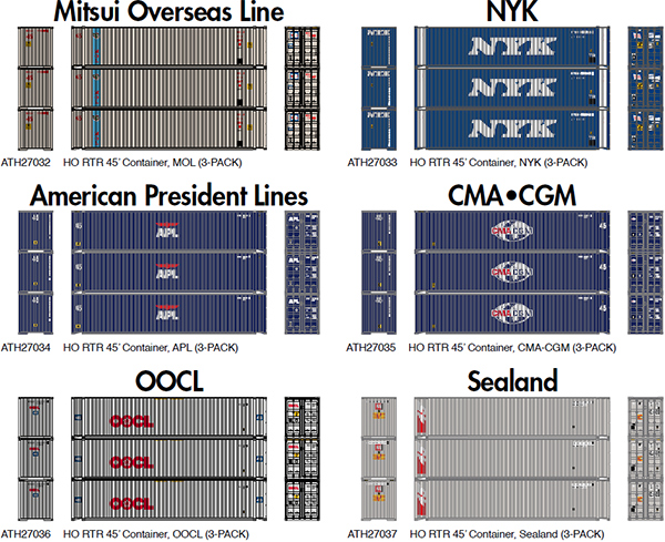 Athearn has announced a new production run of their 45' ocean intermodal container in six paint schemes shown above. Delivery is expected in January 2020. [posted 02/04/2019]