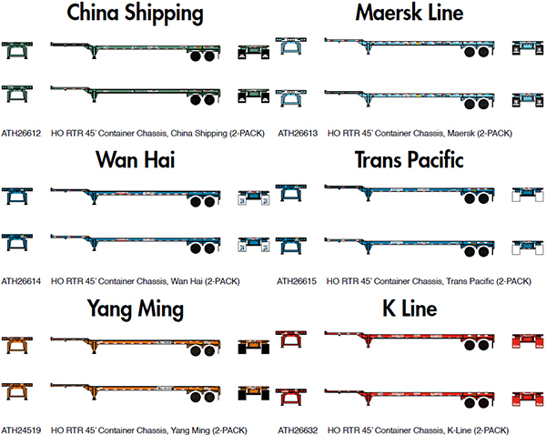 Athearn has announced a new production run of their 45' container highway container chassis in the six paint schemes shown above. Delivery is expected in January 2020. [posted 02/04/2019]