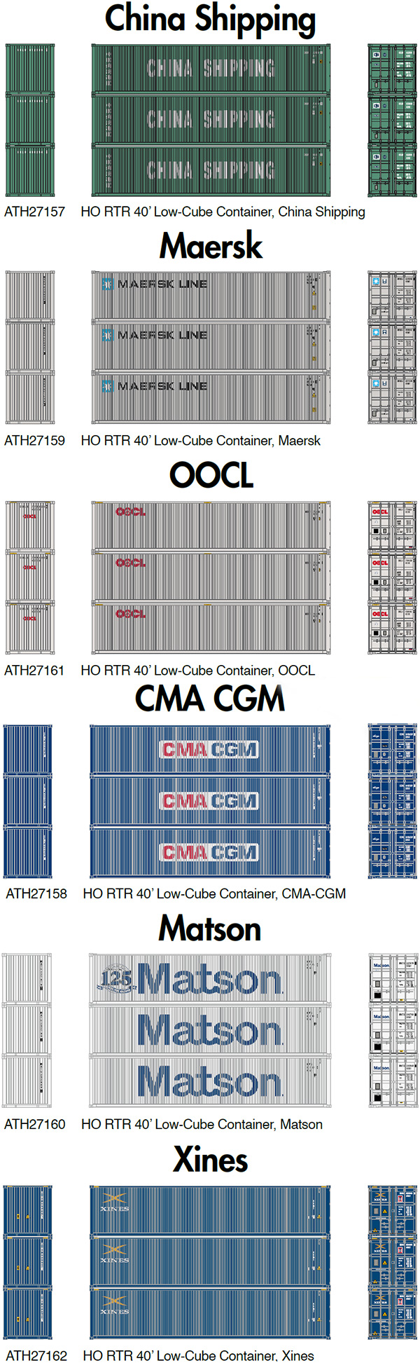 Athearn has announced a new production run of their 40' standard height ocean containers in the six paint schemes shown above, some for the first time. Delivery is expected in December 2019. [posted 01/08/2019]