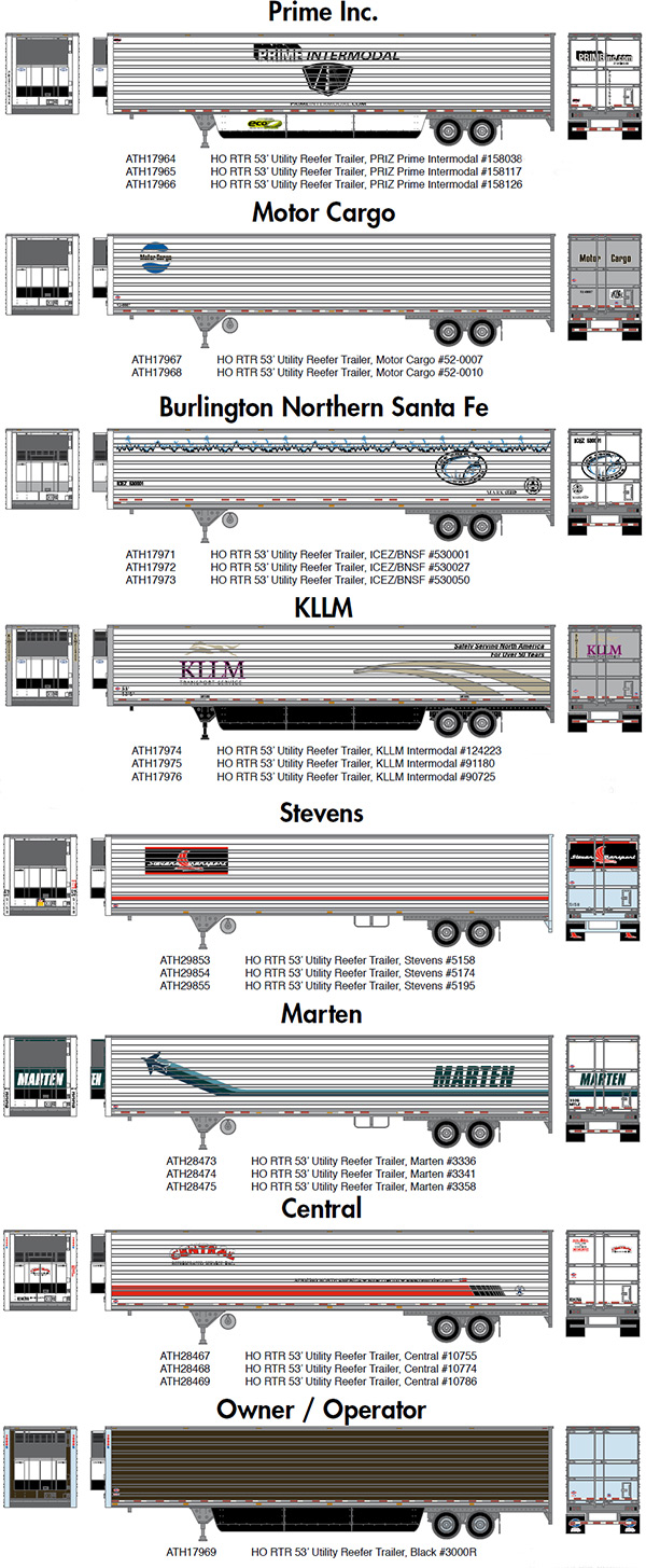 Athearn has announced a new production run of their 53' Utility refrigerated trailer in eight paint schemes shown above. Delivery is expected in December 2019. [posted 01/08/2019]